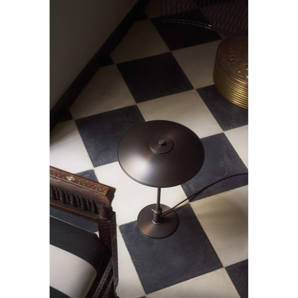 美しいダークブラウンのラッカー塗装を施したエイジド真鍮仕上げは、1920年代のオリジナルPHランプを想起させる佇まい。