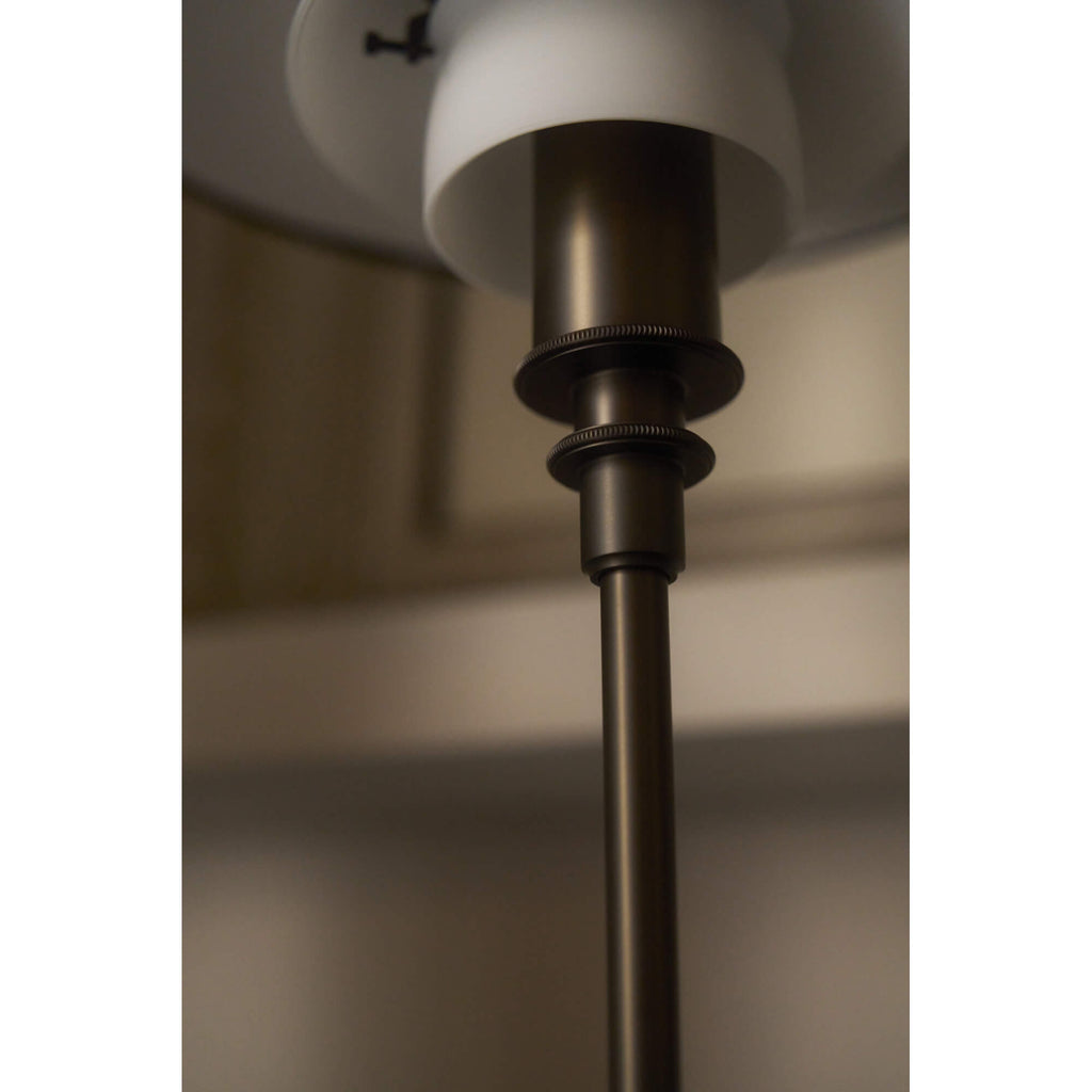 中央および下部のシェードは、3層構造のオパールホワイト吹きガラスで構成。外側は光沢仕上げ、内側はサンドブラストによるマット仕上げとなっており、光を均一に拡散し、柔らかく落ち着いた雰囲気を演出します。