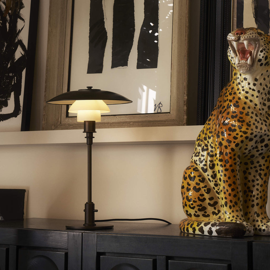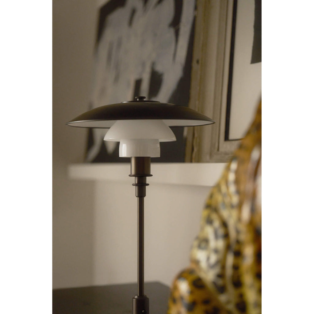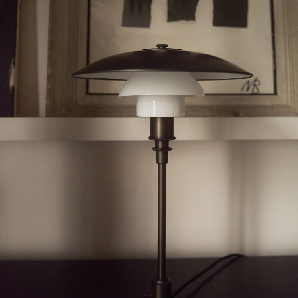 Poul Henningsen(ポール・ヘニングセン)が生み出した反射性3層シェードシステムを受け継ぐ、PH 3/2 Aged Brass Opal テーブルランプ。