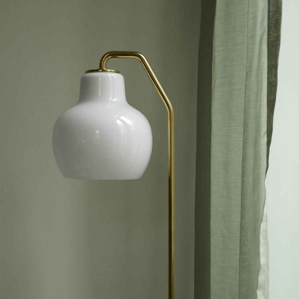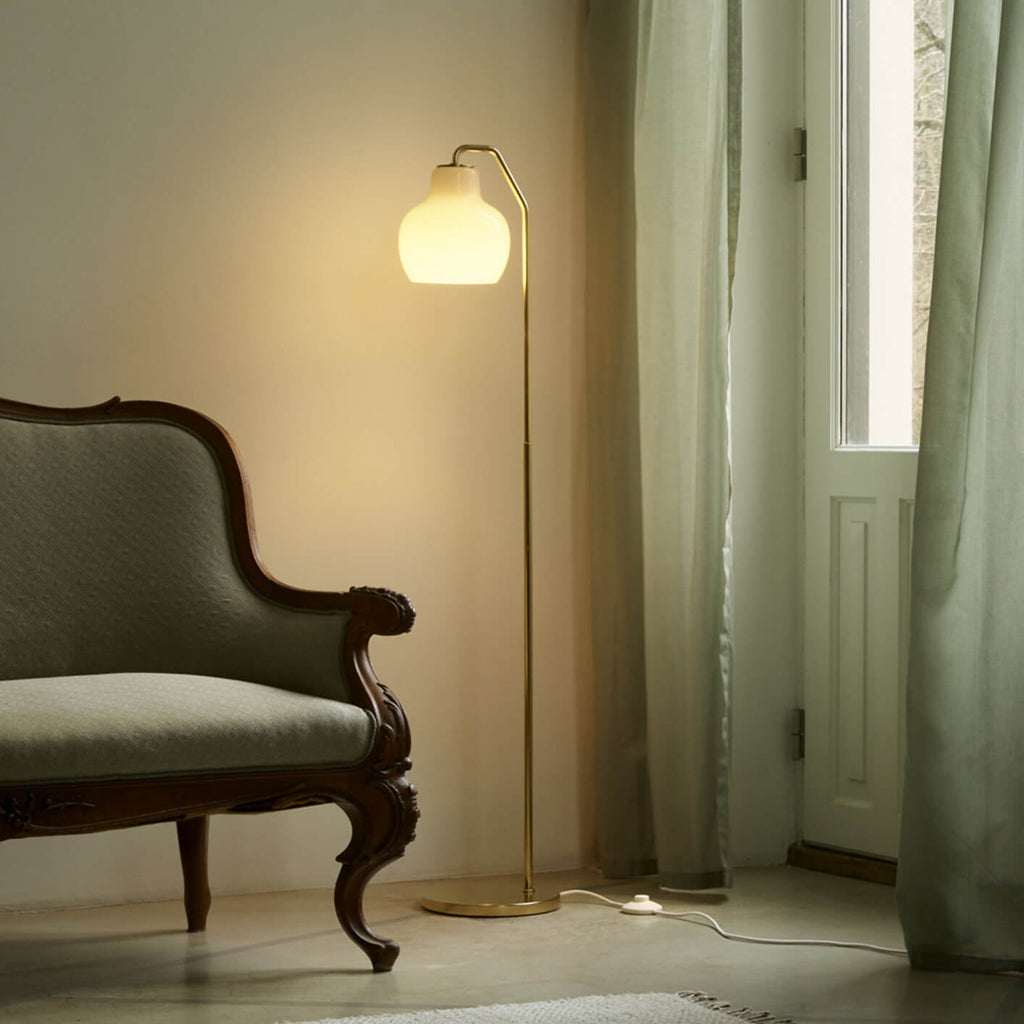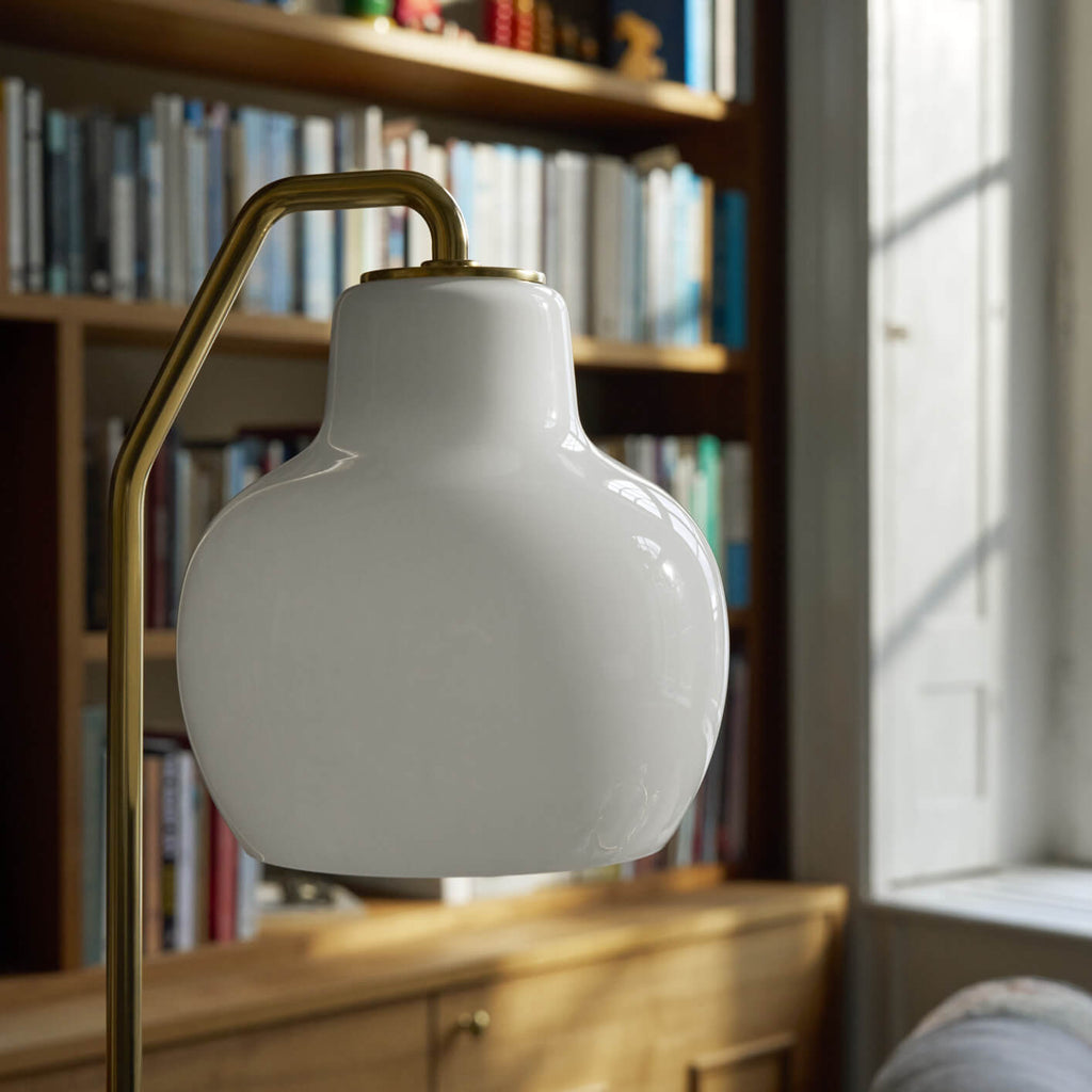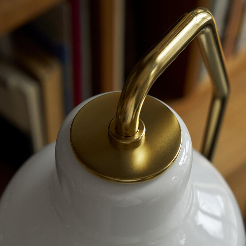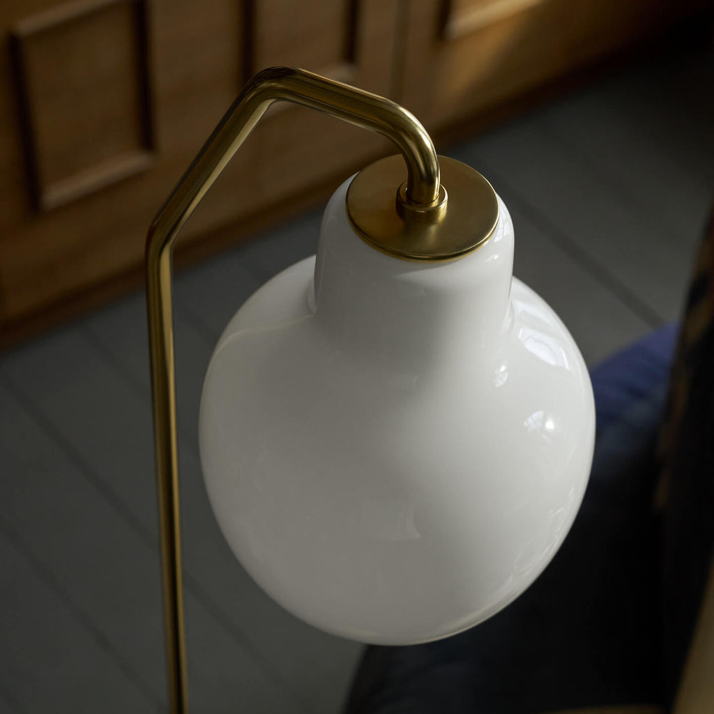 今回のフロアランプとテーブルランプは、そのオリジナルの精神と素材感を忠実に継承。サテンポリッシュ仕上げの真鍮と、光沢のある3層乳白吹きガラスシェードが柔らかな光を生み出し、空間に上質な存在感を添えます。クラシックでありながら現代のインテリアにも溶け込む、普遍的な美しさが魅力です。